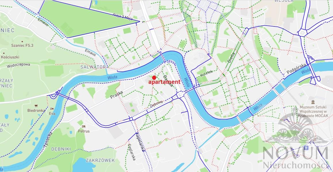 Wokół cudowne, idealne do spacerów lub rowerowych wypraw tereny bulwarów wiślanych, targ warzywny, sklepy, do linii tramwajowej 5 minut piechotą. W okolicy Błonia, Wawel, Salwator, Stare Miasto i wiele innych atrakcji oraz udogodnień /patrz mapka oraz mapka tras rowerowych/. Możliwość parkowania rowerów w garażu.